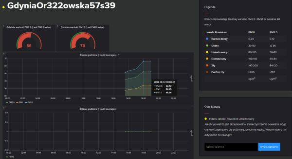 Prezentowane są informacje odnośnie poziomu zanieczyszczeń pyłów zawieszonych PM1, PM2.5 oraz PM10.