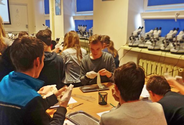 Dowiedzieliśmy się, w jakiej sytuacji ryby mogą zmienić płeć oraz czy konik morski zachodzi w ciążę. Nastepnie w laboratorium uczniowie przeprowadzili analizę ichtiologiczną ryb. Przebieg tej operacji widać na załączonych zdjęciach.
