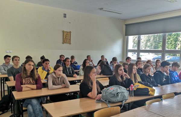 W środę 26.09.2019 gościliśmy w szkole dwoje naszych absolwentów: Natalię Dargę i Filipa Wereszczyńskiego, którzy spotkali się z uczniami klas pierwszych, aby podzielić się z nimi swoimi doświadczeniami zdobytymi dzięki znajomości języka niemieckiego. Filip pracował w czasie wakacji w Niemczech, a Natalia jest zatrudniona obecnie w niemieckiej firmie Bayer w Gdańsku.