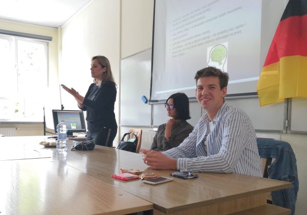 W trakcie spotkania uczniowie wysłuchali również prezentacji nt. ”Jak uczyć się języka niemieckiego”, którą można pobrać z naszej strony. Oprócz wskazówek dotyczących technik uczenia się języka obcego, znajdują się w niej również nazwy aplikacji, stron internetowych, tytuły niemieckich filmów i seriali pomocnych w nauce. Mamy nadzieję, że to spotkanie pozwoliło uczniom dostrzec walory języka niemieckiego z perspektywy jego atrakcyjności w życiu.