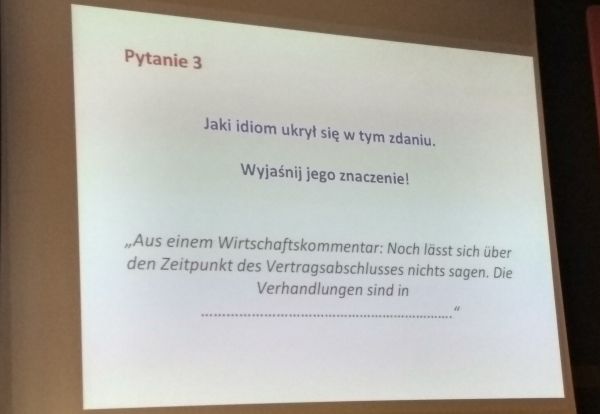 Całej trójce należą się ogromne gratulacje – co najmniej z dwóch powodów. Konkurencja była naprawdę bardzo duża – do konkursu zgłosiło się około 40 zespołów z całego województwa, a idiomy, których znajomością musieli wykazać się nasi uczniowie nie były wcale proste i jednoznaczne. Poza tym trzeba było umieć zastosować je w kontekście, znać ich tłumaczenie po polsku oraz wyjaśnić ich znaczenie po niemiecku.