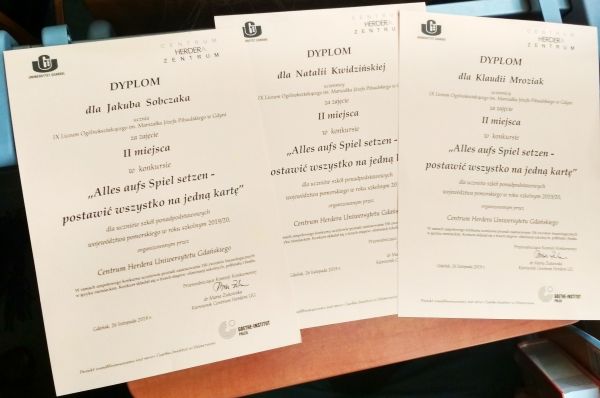 W dniu dzisiejszym uczennice: Natalia Kwidzińska (IIA) i Klaudia Mrozik (IIb) oraz uczeń Jakub Sobczak (IIB) wzięli udział w zespołowym konkursie zorganizowanym przez Centrum Herdera Uniwersytetu Gdańskiego.