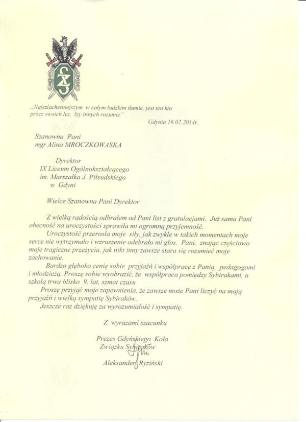 Załączamy gratulacje przesłane przez Dyrektor IX Liceum Ogólnokształcącego Alinę Mroczkowską i odpowiedź pana Aleksandra Ryzińskiego.
