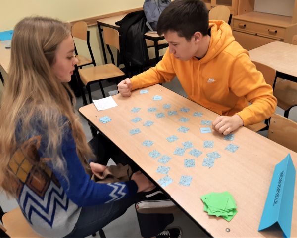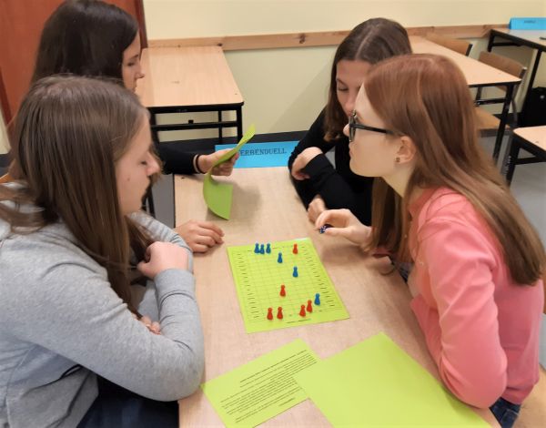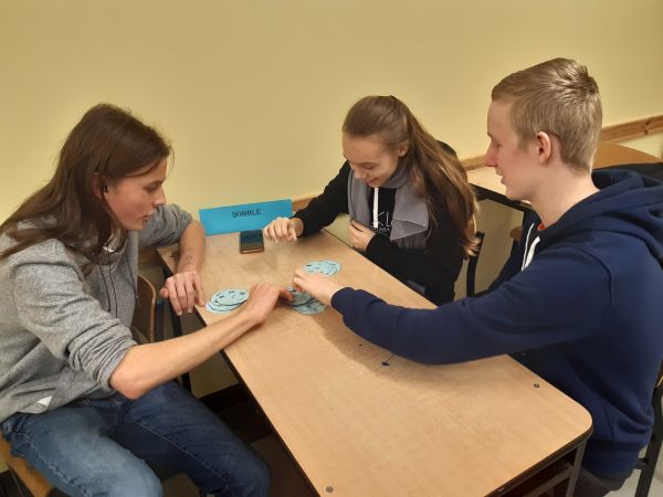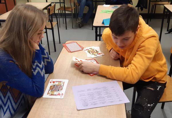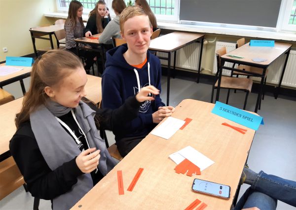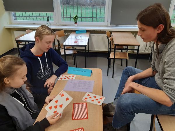 Można było zagrać w gry typu: dooble, memory, 5 sekund, w trakcie których ćwiczyliśmy poznane na zajęciach słownictwo. Grając w grę „ Verbenduell-pojedynek czasowników” utrwalaliśmy koniugację czasowników. Natomiast gry typu Mensch ärgere dich nicht (popularny chińczyk) czy „Sprechende Karten – mówiące karty” pozwoliły nam sprawdzić swoje umiejętności budowania zdań twierdzących i pytających.
