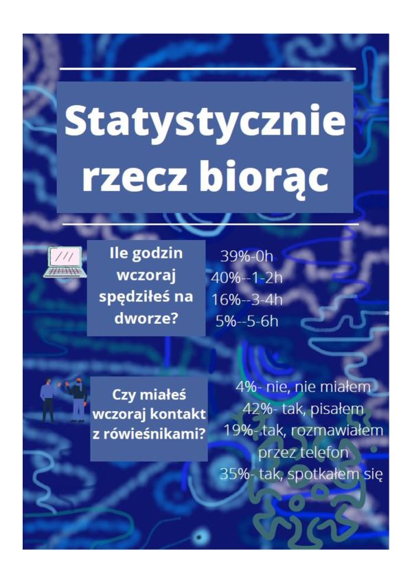 W okresie od marca do czerwca 2021r uczniowie klas drugich realizowali projekt edukacyjny „Statystycznie rzecz biorąc…”. Głównym celem projektu było rozwijanie kompetencji matematycznych, informatycznych i naukowo-technicznych oraz badanie zwyczajów młodzieży podczas pracy zdalnej. Uczniowie zbierali dane statystyczne za pomocą przygotowanego arkusza Forms. Opracowali otrzymane wyniki i wyciągnęli z nich wnioski. Efekty swojej pracy zaprezentowali przed Dyrekcją szkoły oraz nauczycielami i przedstawicielami wszystkich klas w formie prezentacji oraz w postaci posterów 1 czerwca 2021.Wybranie klasy, która poradziła sobie najlepiej z zadaniem nie było łatwe i wszystkim bardzo dziękujemy za ciekawe opracowania i naukową analizę wyników badań, a szczególne gratulacje składamy klasie 2b2.