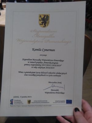 Miło nam poinformować, że nasza uczennica Kamila Cymerman (klasa IIb) uzyskała Stypendium Marszałka Województwa Pomorskiego, którego celem jest wspieranie edukacji uzdolnionej młodzieży.