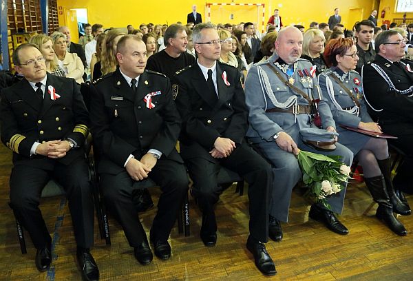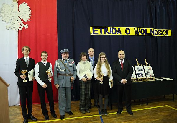 Miłym dla dużej grupy uczniów akcentem było wręczenie nagród w konkursach tematycznie związanych ze Świętem Niepodległości- i tak, puchary, książki i inne upominki oraz okolicznościowe dyplomy odbierali zwycięzcy konkursu historycznego dla gimnazjalistów „Józef Piłsudski- człowiek i polityk, nagrodzeni uczestnicy konkursu „Etiuda o wolności”, konkursu fotograficznego „Barwy nieobojętne”, a także ci, którzy swoimi strojami przypomnieli nam „lata dwudzieste, lata trzydzieste.”