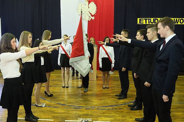 Po odśpiewaniu Mazurka Dąbrowskiego głos zabrała dyrektor szkoły p. Wiesława Krysztofowicz, która przypomniała dziejowe dokonania Polaków, wybijających się przez długie lata na niepodległość, ale też zwróciła uwagę na potrzebę wychowania młodzieży w duchu współczesnego patriotyzmu, przejawiającego się w obywatelskości i zaangażowaniu w budowanie małych ojczyzn. Niezwykle uroczyście wybrzmiały słowa roty ślubowania, odczytane przez p. Olgę Malicką –Kowalczyk – wychowawczynię jednej z klas pierwszych, które tradycyjnie w tym dniu składają ślubowanie na sztandar szkoły, włączające je oficjalnie w poczet uczniów IX LO.