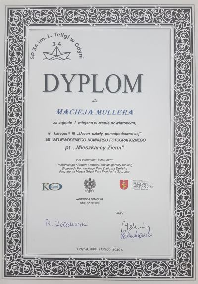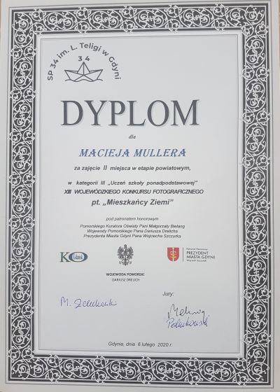 Miło nam poinformować o sukcesie ucznia klasy 1E1 Macieja Müllera, który został laureatem głównej nagrody powiatowego etapu XII Wojewódzkiego Konkursu Fotograficznego „Mieszkańcy Ziemi”. Talent i pracowitość przyniosą mu pewnie jeszcze wiele nagród. Serdecznie gratulujemy!