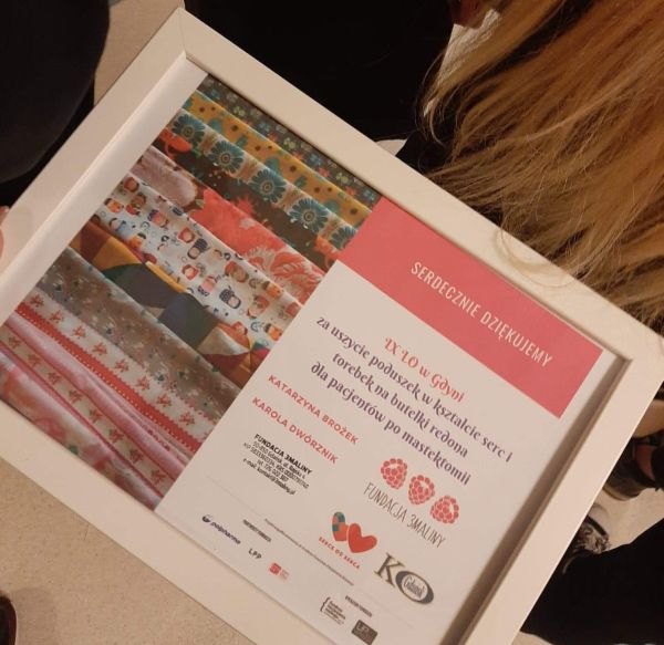 , w ramach którego uszyły 150 torebek na butelki Redona oraz 50 poduszek ułatwiających rekonwalescencję po mastektomii. Następnie przekazały owoce swojej pracy do szpitala w Gdyni Redłowie na oddział onkologii. Zorganizowały również wykład oraz warsztaty dotyczące profilaktyki raka piersi oraz podstawowej nauki szycia we współpracy z fundacją ,,3 maliny”.