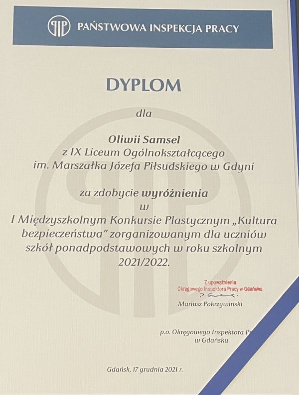 Nagroda dla Oliwii Samsel z klasy I d za wyróżnienie pracy w konkursie plastycznym zorganizowanym przez Okręgową Inspekcję Pracy w Gdańsku w ramach projektu Kultura bezpieczeństwa.