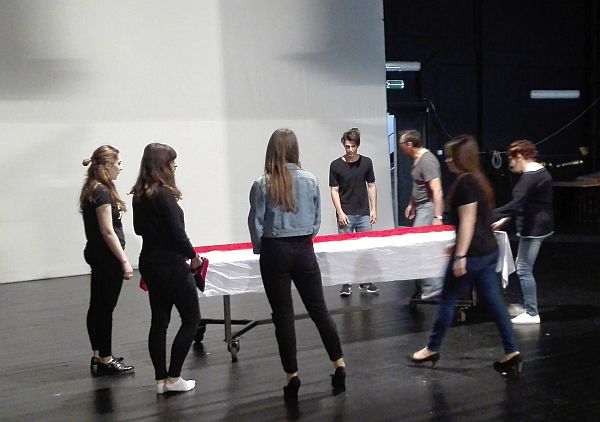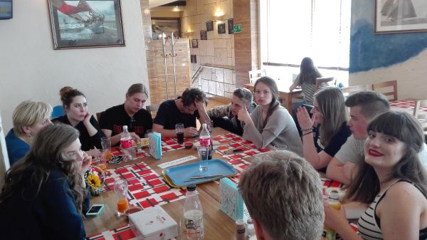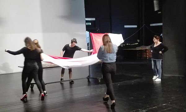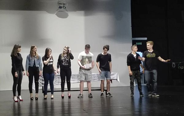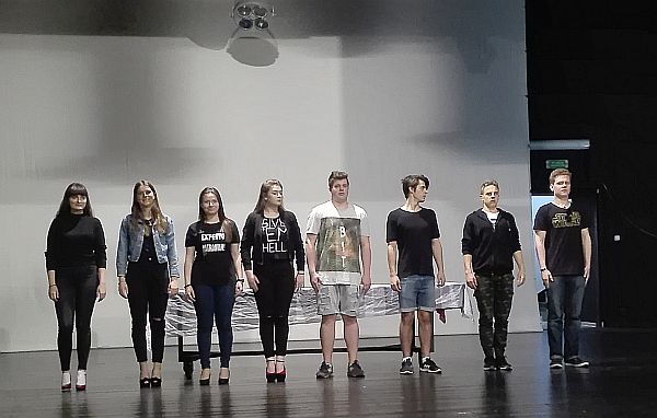 Zespół teatralny z naszej szkoły wylosował tekst pt. Koniec przemocy Bogny Burskiej i Magdy Mosiewicz odnoszący się do aktualnych zagadnień politycznych, społecznych i socjologicznych. W krótkim terminie trzeba było opracować scenariusz i przedstawienie. To naprawdę było trudne wyzwanie! Dzięki profesjonalnej pomocy aktora Teatru Miejskiego, Grzegorza Wolfa, udało się zapanować nad wszystkimi trudnościami i stanąć na wysokości zadania.