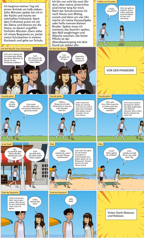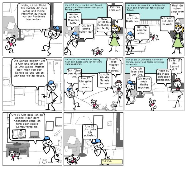 Spośród 7 prac konkursowych na komiks w języku niemieckim pt: „Mój dzień powszedni i moje obowiązki” („Mein Alltag und meine Pflichten zu Hause”) wyłoniony został zwycięzca. Został nim Piotr Zwiefka z klasy IIC1. Oprócz pracy Piotra na wyróżnienie zasłużyły jeszcze dwa komiksy: Nataszy Skulich i Mateusza Sadowskiego oraz Nikity Krutskykh i Stanisława Starosty. Wszystkie trzy komiksy wykonane były bardzo starannie i ciekawie od strony graficznej, jednakże praca Piotra wyróżniała się od pozostałych większą poprawnością językową. Osobom biorącym udział w konkursie dziękuję za zaangażowanie i kreatywność i zapraszam do udziału w kolejnych konkursach.