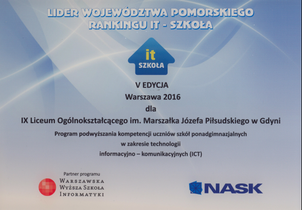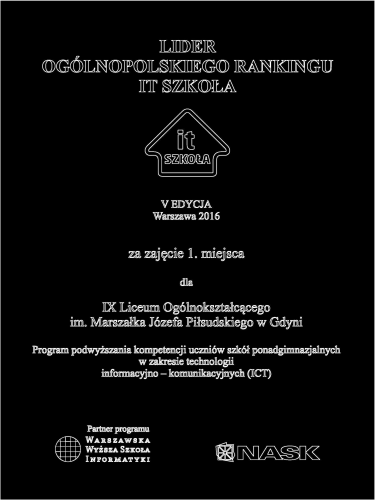 W roku szkolnym 2015/2016 uczniowie IX Liceum zajęli pierwsze miejsce w Rankingu Szkół IT-Szkoła.
